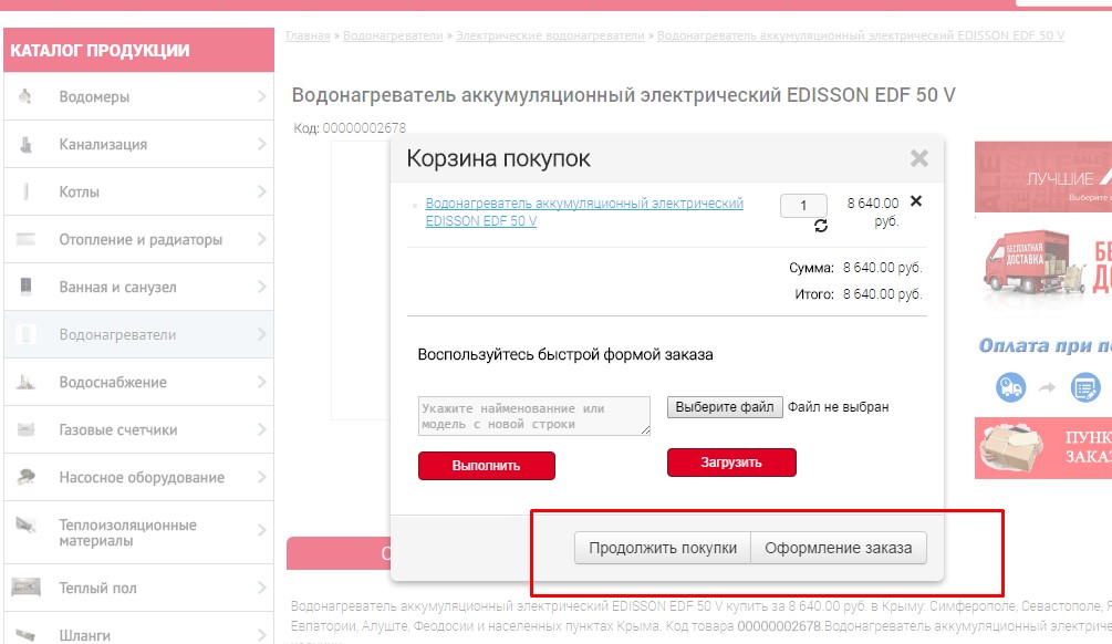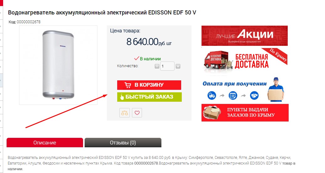 В каталоге товаров на сайте представлено более 2000 товарных позиций. Непосредственно заказ вы можете сделать как на странице товарной категории (например, водонагреватели), так и со страницы конкретного товара, на которой вы сможете подробнее прочитать о товаре, узнать его цену, наличие, озвокомиться с характеристиками (например, водонагреватели -> водонагреватель аккумуляционный электрический EDISSON EDF 50 V).